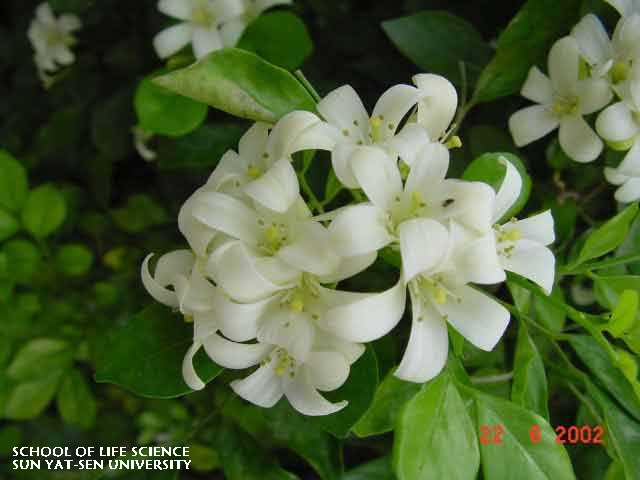 灌木或小喬木,高3-8米,小枝無毛,嫩枝略有毛。奇數羽狀復葉;小葉3-9,互生,小葉形變異大,由卵形至倒卵形至菱形,長2-7厘米,寬1-3厘米,全緣。聚傘花序短,腋生或頂生,花大而少,白色,極芳香,長1.2-1.5厘米,徑達4厘米;萼極小,5片,宿存;花瓣5,有透明腺點。果肉質,紅色長8-12毫米,內含種子1-2粒。花期秋季。