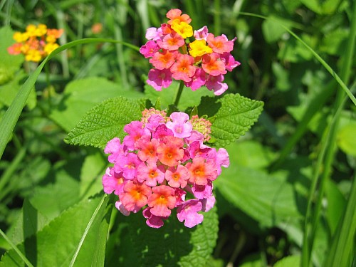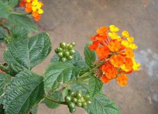 五色梅為常綠灌木,高1一2m,有時枝條生長呈藤狀。莖枝呈四方形,有短柔毛, 通常有短而倒鉤狀刺。單葉對生,卵形或卵狀長圓形,先端漸尖,基部圓形,兩面粗糙有毛,揉爛 有強烈的氣味,頭狀花序腋生于枝梢上部,每個花序20多朵花,花冠筒細長,頂端多五裂,狀似 梅花。花冠顏色多變,黃色、橙黃色、粉紅色、深紅色。