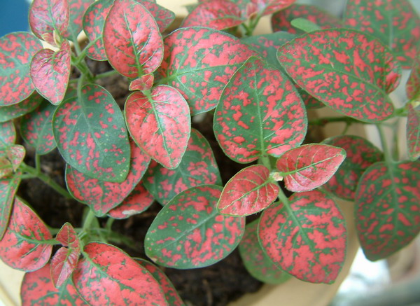 嫣紅蔓株高可達30公分左右,但盆栽種多控制在10-15公分以內,葉對生,呈卵形或長卵形,葉全緣,葉面呈橄欖綠,上面布滿紅色、粉紅色或白色斑點。