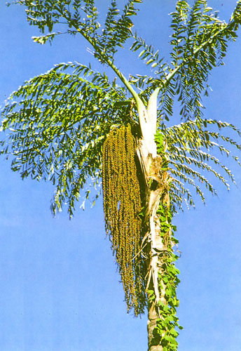 穗狀花序長達(dá)2.5米以上,下垂,花序軸粗壯,分枝花序多達(dá)400-500,長達(dá) 1-1.8米;花極多,每3朵聚生,雌花位于中間,兩側(cè)是雄花;雄花萼片3,具纖毛,花瓣淡紅色,雄蕊30-102;雌花萼片具纖毛,花冠淡綠色,不育雄蕊3,子房2室,胚珠單生。