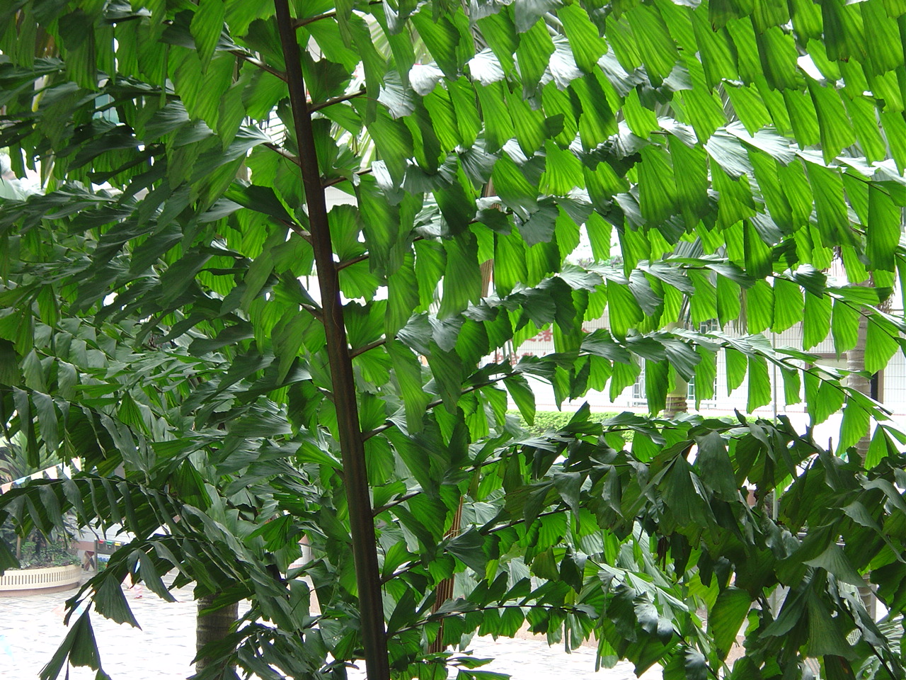 高10-20米,胸徑30-70厘米,樹干中下部常膨大如瓶狀,具的環(huán)狀葉痕。葉聚生于頂部,二回羽狀復(fù)葉,長5.5-6.6米,寬2.6-4米,葉柄粗壯,葉鞘 葉柄及葉軸上被黑褐色糠秕狀鱗片;羽片20-24對,長1.3-2米,每側(cè)有小羽片23-27,成偏斜楔形,邊緣具大小不等的嚙蝕狀缺刻,頂端的一片為寬楔形,具2或3裂。