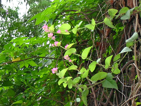 由肥厚的塊根發出,高達10米,有卷須。葉對生,卵形至矩圓狀卵形,長6-14厘米,先端漸尖,基部深心臟形,由明顯的網脈,兩面近禿凈。總狀花序頂生或生于上部葉腋內,花多數,淡紅色,有時白色,長8-10毫米,叢生,花被裂片宿存。瘦果圓錐狀,上部三棱形,長約10毫米。