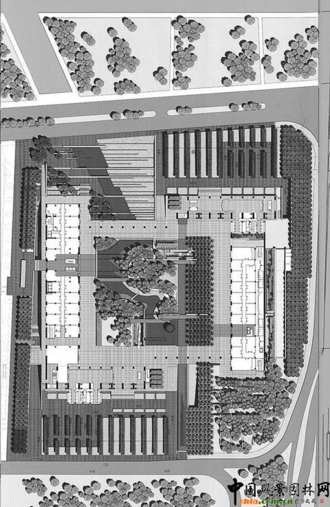 為了回應顧客對中式花園的要求,中心花園的設計中應用了典型的中式花園的氣息,陰與陽,順序與排列等。在花園里,線性的噴泉被做成玻璃槽,這樣,光線就能夠通過它們進入下面的展示空間,而木平臺和樹陣則成為了聚會的場所。