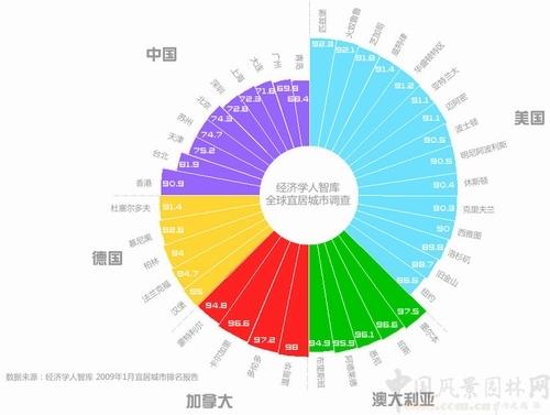 2009年-2011年中國進入“宜居城市榜”評選范圍的城市保持10個不變,盡管這個數(shù)字與發(fā)達國家相差不大,但對比得分距離落差較大;榜上前10名幾乎由澳洲和加拿大城市壟斷:2011年排在“宜居城市”前10名的城市中并無中國城市,而加拿大和澳大利亞則包辦了7個,溫哥華則從2007年開始一直高居榜首。