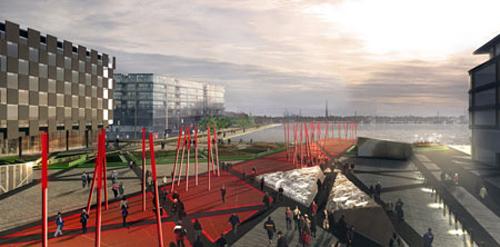 由劇院延伸出的“紅地毯”碼頭,穿過草地和植被組成的棋盤。紅地毯是由紅色的樹脂玻璃和紅色植被組成的。由多邊形綠植所組成的地毯,提供了足夠的座椅,穿過廣場(chǎng),連接新建的飯店和辦公開發(fā)區(qū)域。以沼地植物為特色的植栽柔化了空間,并喚起場(chǎng)地原先作為沼澤地存在的回憶。多彩和多樣的空間將作為新建筑的場(chǎng)地。