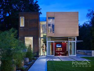 這個規劃必需容納一家六口,并作為娛樂和展示逐漸成長的當代藝術的收藏的一個平臺。容納家庭和藝術的雙重需要使“被服務”和“服務”的概念成為了為房屋設計的有組織的工具。功能的分區也允許藝術和孩子并肩生活,并因彼此而更加富足。房屋有四個截然不同的部分組成:玻璃圍繞的主樓生活區,木頭包裹的上部臥室層,鋼鐵鎧裝的延伸到背面的“服務”區域,以及一間懸臂的灰泥覆蓋的辦公室。房屋的基礎概念是一條可延伸房屋長度的直線的,充滿光線的走廊。這片空間在所有的樓層中把“被服務”從“服務”的功能中分離出來,包括平面的和縱切面的。