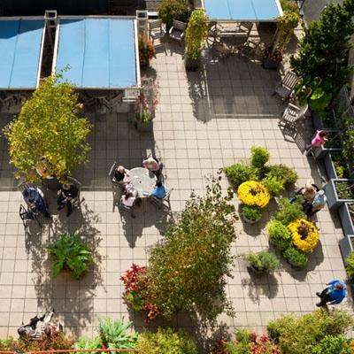 這個屋頂康復園圍繞著一系列花房設計,大小不一,主題不同,適于進行器械活動、非正式交談、靜思冥想或者安靜獨居。根據個人對舒適度的需求可以調節光照,從全陰影、半陰半陽過度到全陽光。強調操作簡單,鼓勵居民采取自助游園。為了方便使用,花盆大小不一,高低不同,有些特殊地帶進行地面噴漆,吸引高層居民的興趣,指示康復園的方位。同時,還將園藝療法與護理中心的檢查結合起來,促進患者更好康復。
