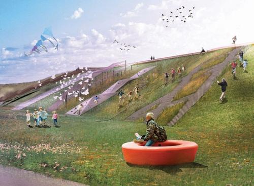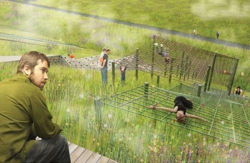 在市民提交的59個(gè)方案中,僅有9個(gè)入圍,這些入圍方案有機(jī)會(huì)進(jìn)一步發(fā)展他們的想法。ACT(ACTIVE CITY TRANSFORMATION)公司提交的方案最為新穎獨(dú)特:沿高速公路隔音屏蔽建立以供活動(dòng)的公園。這個(gè)隔音屏蔽是條長達(dá)1.4千米的條形坡地,它與一個(gè)大型居民區(qū)直接相連。