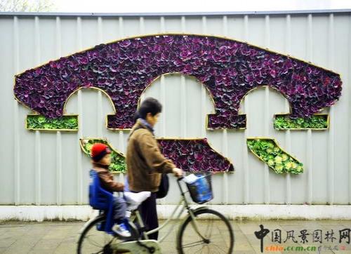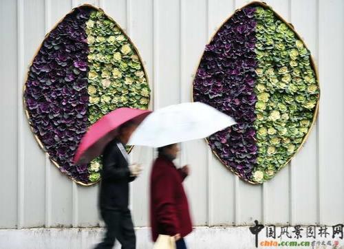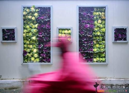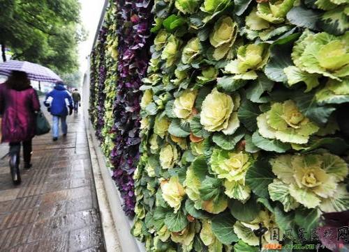據悉,該工地正位于杭州市首批16個“美化家園工程示范點”之一的湖墅南路最南端,為美化工地現場的外圍環境,并與周邊道路綠化相協調,拱墅區城管辦綠化科與施工方合作,在工地的圍墻上等距間隔地嵌入了九只特制的金屬框架,預留出不同幾何圖形的鏤空位置,用木板分隔成一道道傾斜的橫擱板,在每道擱板上鋪上營養土,配置滴灌系統,再種入一排排形如“牡丹”的黃綠色或紫色羽衣甘藍,總共逾萬棵的垂直種植的羽衣甘藍構成這一面面盛開的“花墻”。