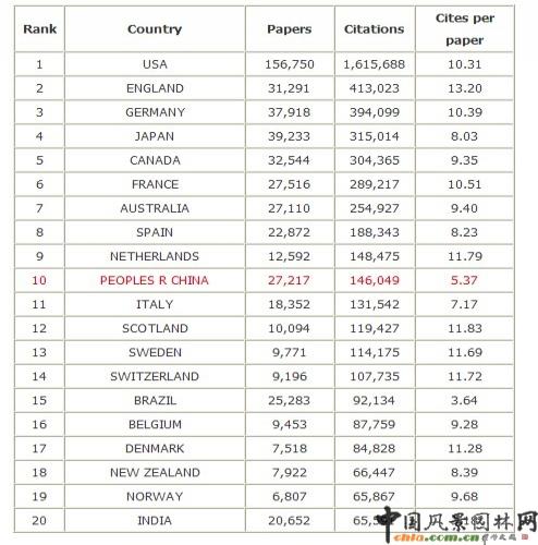 湯森路透科技信息集團近日推出近十年動物與植物科學領域論文總引用次數前20名國家或地區排名,統計時間段為2000年1月至2010年12月31日。其中,美國的論文發表總數、論文總引用次數和平均每篇論文引用次數分別為156750、1615688和10。31,位居首位;中國的論文發表總數、論文總引用次數和平均每篇論文引用次數分別為27217、146049和5。37,位列第十。以下為詳細排名: