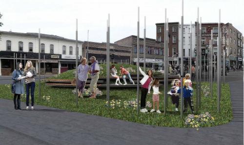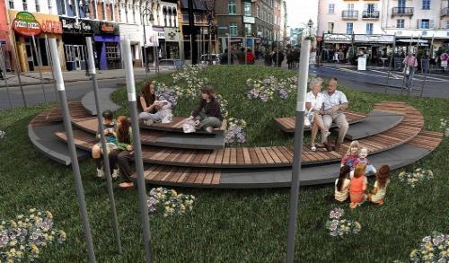 這項工程包含了三個概念性的元素:“綠色山坡”、“圓形梯椅”和“街燈林”。