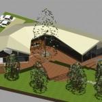“貝殼館”(ShellHouse)的外形輪廓呈現了J的形狀,內側外墻升起地面1.4米,產生好像漂浮半空的平臺。利用Ulin木材圍繞著建筑創建了階梯狀臺階,圍繞出一個家庭活動的中心庭院。