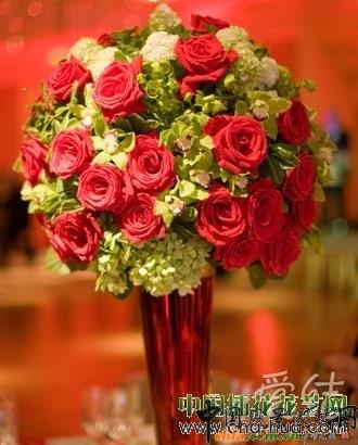 喜歡經典的新人,圓球形的桌花是個不錯的選擇,搭配長錐形的紅色花器,紅花與綠葉的相依相襯,在色彩上賺足了眼球。