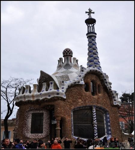 公園的整個布局圍繞一條中心軸線。大門兩側分別是警衛(wèi)室和辦公室,屋頂是傳統(tǒng)的加泰隆尼亞式磚砌穹頂,碎石砌筑的墻、色彩斑斕的馬賽克裝飾和10米高的像一棵椰子樹的裝飾塔,在藍天白云襯托下格外醒目。塔尖的立體羅馬十字造型,是高迪的“注冊商標”之一,這個童話的王國——是古爾公園給人的第一個、也是最深刻的印象。公園的每件建筑設計,都被戲稱為“遺落人間的玩具”。