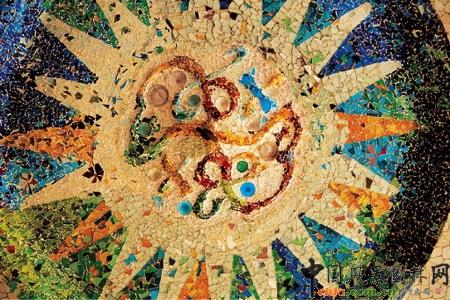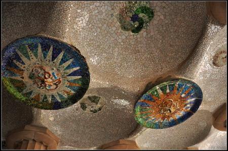 86根陶立克式圓柱支撐著波浪形狀的天花板,這些圓柱的一個(gè)作用是支撐屋頂,另一個(gè)絕妙的用途是排水:當(dāng)下雨的時(shí)候,雨水會(huì)從頂部順著這些空心的柱子流入地下再到階梯扶手處。而頂部設(shè)計(jì)為幾個(gè)大圓形拱頂交疊而成的波浪狀也是為了能把水順著拱面集中在相對(duì)位置較低的柱子處。用彩色石鑲嵌的天花板,有的用綠琥珀,有的用裝香水的碎瓶子裝飾,大多為藍(lán)色或綠色的圓形背景上加色彩斑斕的太陽(yáng)圖案,閃閃發(fā)光,十分漂亮。高迪考慮到當(dāng)時(shí)市場(chǎng)的功能,在圓柱的最下方裝了白色馬賽克,是為了便于清潔用的。