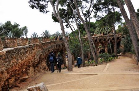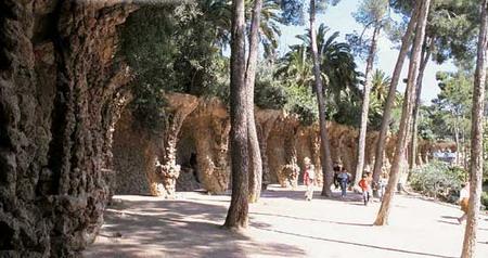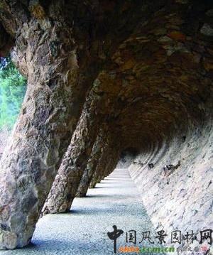 古爾公園將高迪的建筑天賦展示得淋漓盡致。這里地形復雜,增加了填土和修筑土堤的難度。為避免耗資巨大的石質挖方工程,高迪設計建造了三座高度不同的高架走廊。高架走廊依山勢建造,其使用的材料均是當地施工挖出的土石,由此與周圍的自然環境極為統一和諧。高架走廊可以說是古爾公園的人行道,上方可以走人,下方廊子亦可。而百柱廳兩側的這段走廊,是廣告片和電影導演鐘愛的場景;另一條最低地勢的走廊,為兩排向內傾斜的石柱支撐。在技法上,高迪將柱身的直徑大大增加,柱溝的數目卻有意減少,曲線的文飾更加厚重,扁平的頸部堅定厚實,以區別于希臘苗條纖細的柔軟。此外中楣和上楣三角槽的排檔上懸垂的錐形裝飾也體現了自然主義的風格,它讓人追憶起建筑誕生的古代。事實上,高迪發明了一種新的柱形,就地取材,提升社區品質,并將建筑融入周圍環境,石柱的莊嚴與那明亮鮮活的瞭望臺形成了強烈對比,這就使坡地建筑達到最大的功效。這些沒有底座的石柱,看上去好像從地里生長出的樹干。在高架走廊的設計中,自然形式與建筑形式之間開始了真正的對話。