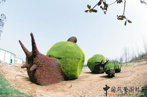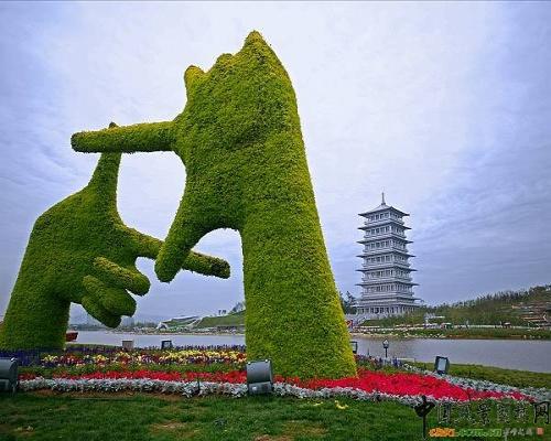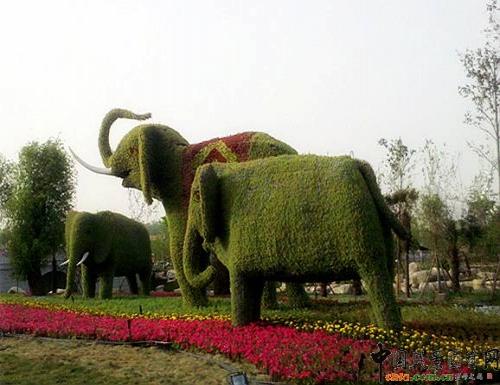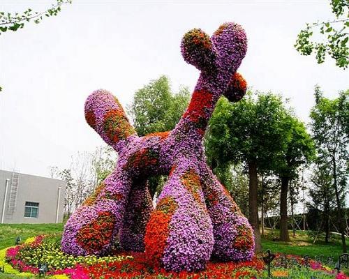 “綠雕”被譽(yù)為世界園林藝術(shù)的奇葩,是一種有生命的植物雕塑。一般內(nèi)設(shè)鋼材構(gòu)架,然后在構(gòu)架上填充栽培土,再于其上種植一年生或多年生小灌木或草本植物,即采用掛泥插草或卡盆工藝把不同顏色的花草覆蓋在結(jié)構(gòu)造型的表面,巧妙地把雕塑造型與花卉園藝結(jié)合在一起,鋼架表面的植物覆蓋率至少要達(dá)到80%。因此,綠雕是充滿生機(jī)的“花卉雕塑”,是人類運(yùn)用自然力量創(chuàng)造出的又一園藝文明。