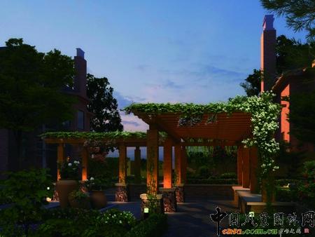 北入口廊架:廊架構造,木質壓頂給人以厚重、親切的感覺;石砌基礎增加整體體量感;在夜間燈光照射下,水簾的輕盈、吉祥花境的若隱若現烘托浪漫溫暖的氣氛。