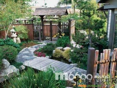 花園的大門設計別具匠心,木門木瓦的傳統樣式讓人在門外就感受到懷舊、質樸的東方氣質。將園門向院內退入1米空間的設計,讓人感覺到庭院的幽深感,也為門口位置提供了更加充足的種植空間,豐富了花園的立面層次。園門配合四周的竹柵欄,阻隔一定的視線,更增加了花園的審美情趣。