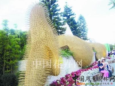 竹材韌性強,在園林景觀中常被設計成各種小品。昆明世博園竹園內的竹簡,堪稱竹材小品的典范,設計師模仿中國古代竹簡樣式,用直徑20厘米左右的巨龍竹連接,竹簡高2.5米,全長3米,1/3為卷筒狀,2/3展開成平面。竹簡上雕刻古人贊竹詩句,濃縮了中國的竹文化。該小品通過古樸、雋秀、高雅的藝術手法,把竹子的歷史與現實融為一體,又借助古人詩句的魅力,對自然竹景作一畫龍點睛的提示,讓人不僅感受到竹子的外在美,還能領會到竹子剛直不阿、自強自立的精神風貌。再如臺北花博會公園入口處以竹簽為主體建造的大毛蟲,形象逼真,特色鮮明,令人贊嘆竹材之無限創意。