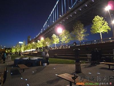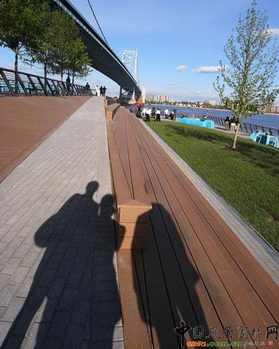 “原來的Race街碼頭始建于1896年,包括大量的兩層建筑,以滿足各種需求;下層用來停泊船只,上層用來娛樂。新的碼頭也設(shè)計(jì)了兩層——上層完美的露天散步場,下層是社交娛樂場所。本杰明.富蘭克林大橋北面有12英尺傾斜上升的斜坡,透視效果使你感覺就要到達(dá)河邊。多功能草坪上設(shè)有階梯,既能坐又能躺。長長的階梯座椅將兩層連接起來,環(huán)繞了碼頭一端,放大了身處邊緣的魔幻感覺。