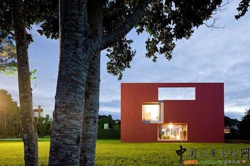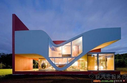 若干堆疊相交的體塊由一個占支配地位的波浪形體量連接,就好像是從住宅中間直接截斷一樣。建筑師還設計了大小不同的封閉平臺和一個波狀的屋頂露臺,它們與大紅色的墻面結合,形成了對比鮮明的效果,共同定義了建筑的整體美學風格和空間布局。