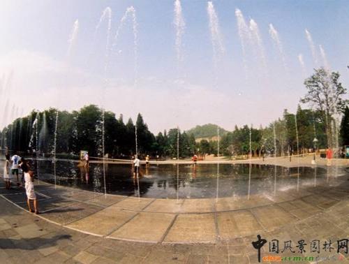 西南門廣場西側安裝一座音樂噴泉,噴泉東側是三個中間低、四周高的水膜廣場,水膜厚度0-20厘米,廣場的南北兩側是疏林草地,在炎炎的夏季,噴泉各種各樣的水柱伴隨著美妙的音樂翩翩起舞,兒童在水膜中戲水玩耍,游人在水膜廣場周圍欣賞著噴泉和周圍的美景,一幅歡快、祥和的景象展現在游人面前。