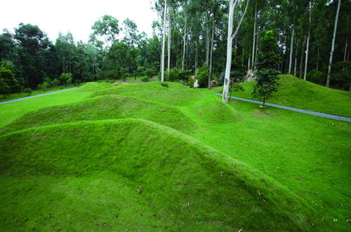 為便于日常園林維護和管理,以及考慮到游客的安全,本專類園就地用紅壤堆成一個直徑約為10米的半圓形的土坡,并鋪上臺灣草,以象征貝殼山。