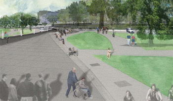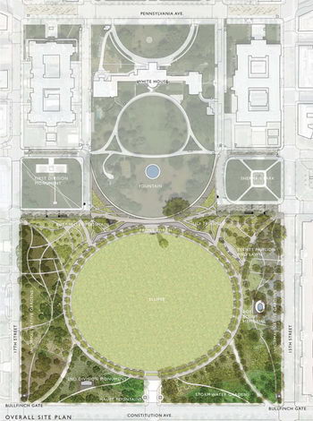 E街和南總統公園的設計構想建立在融合的想法上,如何在保證白宮安全性的基礎上,為美國民眾創造出動態活力的景觀。景觀空間如何做到兩全其美,通過整合場地建筑與形式概念嗎?一個良好社會的標志特征是帶著過去前進。通過并行舊與新,景觀能夠繼承傳統。新的設計借鑒了唐寧循環道路形式。花邊裝飾和蜿蜒曲折的形式結構,旋轉重疊,縮小在白宮的背景中。
