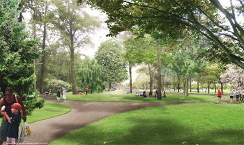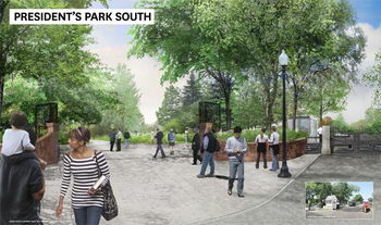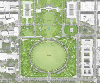 盡管橢圓草坪較好的應(yīng)付四季的活動(dòng),但是日復(fù)一日如此下去,游覽者可能會(huì)感覺52公頃的草地不再受歡迎。在 L’Enfant的想象中,這里是一個(gè)連接白宮和紀(jì)念核心的重要橋梁,今天的南總統(tǒng)花園缺少的是適合的人的尺度。這項(xiàng)計(jì)劃可以活化橢圓結(jié)構(gòu),靈感來(lái)自于安德魯.杰克遜.唐寧1851年的“榆樹蔭道、車輛道、蔭蔽小樹林的行人道系統(tǒng)以及有此環(huán)繞的大圓形開放空間”。橢圓形的四個(gè)角都有入口,通向新的道路系統(tǒng),路邊種滿了樹木,低矮草叢,大量的座椅和其他景觀加強(qiáng)了橢圓草坪與白宮和國(guó)家紀(jì)念碑的連接性。