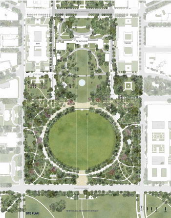 南總統(tǒng)公園散步道和重建的橢圓草坪將原本沖突兩種目的結(jié)合起來,從一方面說,確保政府的安全性是永恒的條件,從另一方面說,增加游客對總統(tǒng)府邸的體驗(yàn)效果。我們的目標(biāo)就是將這兩個(gè)目標(biāo)整合起來,從而直接表達(dá)出人的自由與莊重。南散步道采用有效的安全策略,為行人創(chuàng)造了一種莊嚴(yán)感。以這種方式,散步道整合了兩種國家最重要的文化景觀,第一是白宮的南草坪,在這里居住的歷屆總統(tǒng)都對其進(jìn)行過翻修,而且杰出的景觀規(guī)劃設(shè)計(jì)師奧姆斯特德參與草坪的設(shè)計(jì),第二是橢圓草坪使了有待發(fā)展的連續(xù)的統(tǒng)一的設(shè)計(jì),由景觀幻想家:喬治.華盛頓,Pierre Charles L’Enfant,托馬斯.杰斐遜,安德魯.杰克遜.唐寧和奧姆斯特德。