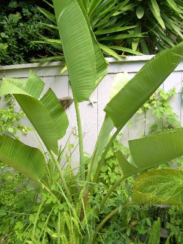 它看起來有點像香蕉樹,直立的生長習性和5--10英尺長的葉片