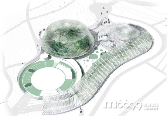 項(xiàng)目的第三部分是室外花園,其中一部分有屋頂,通過長長的玻璃走廊連接到溫室。溫室最大的圓頂覆蓋玻璃,讓自然光培育植物。
