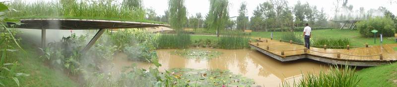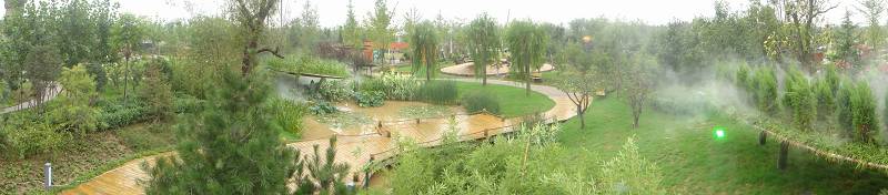 展園由一條飄逸的S形路網,將都是繁花、枯木沙丘、濕地甘泉、荒山育林四個主題景觀區域貫通,通過堆山理水的造園手法,將狹長的場地特色充分發揮,增強了景深效果,沿園路行進,景觀豐富充盈,步移景異,在園路的串接下相互聯系,啟承轉合,交相呼應,從不同的側面表達了綠色無處不在的主題。
