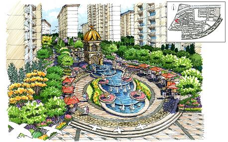 精致的歐式廊架,開闊的草坪,茂密的背景林帶,典雅的雕塑構成了整個軸線景觀,使其更生態,并富有趣味性。道路設計中巧妙繞開采光井,并將其裝飾為景觀小品,結合花砵和水在細節處體現更多的新古典風情。以組團式的配置手法,通過植物的高低、大小、錯落來為何相對獨立的景觀空間,為周邊的住戶提供舒適戶外休閑的交流場所,同時也成為小區的景觀焦點。