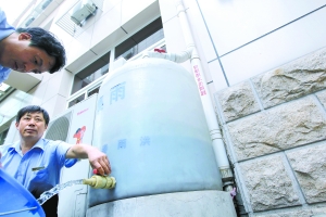 ▲▲市政市容委院內,工人們正在接用雨水回收系統內的水,這些水被用來澆花。本報記者 饒強攝