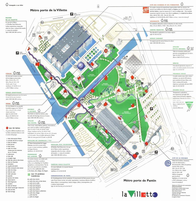 拉維萊特公園面積33公頃,是巴黎市區內最大的公園之一。包括公園北面的國家科學、技術和工業展覽館以及南面的鋼架玻璃大廳和音樂城,總占地面積達到55公頃。在交通上以環城公路和兩條地鐵線與巴黎相聯系。園址上有兩條開挖于19世紀初期的運河區,東西向的烏爾克運河主要為巴黎的輸水和排水需要修建的,它將全園一分為二:南北向的圣德尼運河是園址上已有的最重要的景觀構成要素,而且運河本身就是人、自然與技術相結合的產物,與公園的主題十分貼切,所以參賽的許多方案都是由此作為設計的出發點。在公園的總體設計上屈米強調了變化統一的原則。雖然各體系、各建筑要素和植物要素之間存在著很大的反差,卻完全統一在建筑式的處理手法和紅色的“游樂亭”的控制之下。而對于10個主題花園的設計卻風格迥異,毫不重復,彼此之間有很大的差異感和斷裂感。因此,拉維萊特公園的多樣性更多的是體現在各個主題花園的處理上,而不是公園的整體框架上。與凡爾賽中的小園林一樣,主題花園也是拉維萊特公園中最有趣和吸引人的地方,它滿足了不同文化層次及年齡游人的需要。“鏡園”是在歐洲赤松和楓樹中豎立著20塊整體石碑,一側貼有鏡面,鏡子內外景色相映或趣,使人難辨真假;“風園”中造型穩中有降的游戲設施讓兒童體會微妙的動感;“水園”著重表現水的物理特征,水的霧化景觀與電腦控制的水簾、跌水或滴水景觀經過精心安排,同樣富有觀賞性,夏季又是兒童們喜愛的小游水池;“葡萄園”以臺地、跌水、水渠、金屬架、葡萄苗等為素材,藝術地再現了法國南部波爾多地區的葡萄園景觀;而下沉式的“竹園”為的是形成良好的小氣候,由30多種竹子構成的竹林景觀是巴黎市民難得一見的“異國情調”;處于竹園盡端的“音響圓廳”與意大利莊園中的水劇場有異曲同工之妙;“恐怖童話園”是以音樂來喚起人們從童話中獲得的人生第一次“恐怖”經歷;“少年園”以一系列非常雕塑化和形象化的游戲設施來吸引少年們,架設在運河上的“獨木橋”讓少年們體會走鋼絲的感覺;最后,“龍園”中是以一條巨龍為造型的滑梯,吸引著兒童及成年人躍躍欲試。“鏡園”、“恐怖童話園”、“少年園”和“龍園”是由屈米設計的。