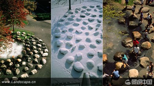 哈佛大學校園內的唐納噴泉位于一個交叉路口,是一個由159塊巨石組成的圓形石陣,所有石塊都鑲嵌于草地之中,呈不規則排列狀。石陣的中央是一座霧噴泉,噴出的水霧彌漫在石頭上,噴泉會隨著季節和時間而變化,到了冬天則由集中供熱系統提供蒸汽,人們在經過或者穿越石陣時,會有強烈的神秘感。唐納噴泉充分展示了沃克對于極簡主義手法運用的純熟。巨石陣源自他對英國遠古巨石柱陣的研究,同時質樸的巨石與周圍古典建筑風格完全協調,而圓形的布置方式則暗示著石陣與周圍環境的聯系。與其原型:安德魯的雕塑作品“石之原野”比起來,這件作品從內容和功能上都已經超越了它,唐納噴泉也因此被看做是沃克的一件典型的極簡主義園林作品。