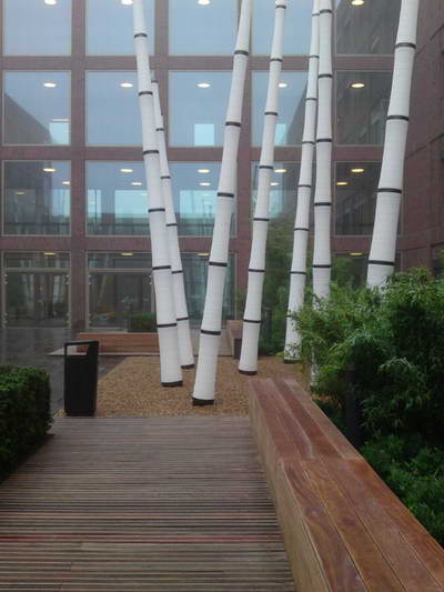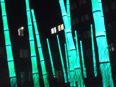 在前兩個(gè)露臺(tái)中,除了超大號(hào)的座椅,巨大的長(zhǎng)方形燈光組實(shí)現(xiàn)極簡(jiǎn)主義設(shè)計(jì),夜晚燈光點(diǎn)亮,成為露臺(tái)搶眼的景觀(guān)。這些座椅上方有巨大的皂莢樹(shù),為人們遮陰。后兩個(gè)園子選擇用竹子作為主題,詮釋了現(xiàn)代竹園的含義。種類(lèi)多樣的竹子和草坪為龐大的竹子燈景創(chuàng)造了完美的景觀(guān)。