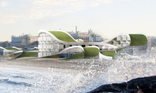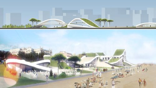 JDS建筑師事務所為意大利的里米尼鎮(Rimini)設計了新的海景岸線。他們已經將該項目開發成一個城市電影膠片地帶-線性的城市走廊結構,在這里室內外活動交織在纏繞的寬曲線中。平面形體依據Burle Marx的夢幻圖案Copacabana寬曲線,但將其定義到三維空間。這種強有力的、易于識別的圖案呼應了沙丘的波紋和海水波浪,并且具有極強的縱向和橫向的連接能力:在便利了寬曲線空間里行人徘徊的同時,整合了城市與街道間的聯系。整個公共概念還涵蓋了一個地下半層的大型停車場,因此使得人們不用爬到地面之上就能將寬廣的海景盡收眼底。此概念是對大量海邊遮擋海景構筑物的一種策略性解決方案。