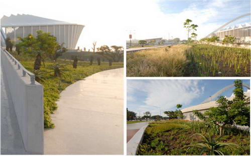 “就軟景植物選擇來說,它加強了‘場地的感覺’,夸祖魯—納塔爾本土物種被廣泛使用。樹種類型選擇適度考慮到臨近海邊特點,營造了地區小氣候。便于養護和灌溉性也被列入考察范圍,各種植物將為本地的鳥類、昆蟲和城市野生動物提供食物和庇護場所。”