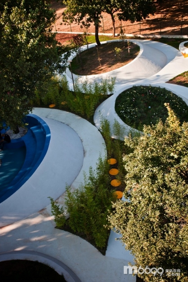 位于意大利弗羅西諾內(nèi)市境內(nèi),毗鄰Corso Lazio的這片區(qū)域終于盼來已等待25年之久的首個公共空間。這個美麗的花園是一個大型總體規(guī)劃的起點,整個規(guī)劃旨在復(fù)興公共空間及服務(wù)性空間并將其并入鄰近的住宅區(qū)。公共區(qū)域的缺乏成為整個地區(qū)發(fā)展的桎梏,并使得鄰近住宅區(qū)的發(fā)展不可持續(xù)。因此花園項目強化了建造一個集有集聚性、趣味性、感官知覺性以及互動親密性于一身的關(guān)聯(lián)空間以滿足社交活動需要的理念,就如同公共領(lǐng)域中的私人起居空間。整個花園在人工與自然元素交錯連接,形成一種張力。