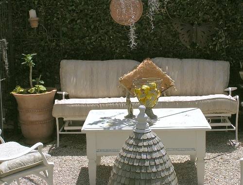 將各種有趣的家具和園林小品進(jìn)行有機(jī)組合,形成了一個(gè)完美的迷人的戶外客廳。石質(zhì)天井地板與白色沙發(fā),椅子和表,西班牙苔蘚與鐵涼亭的自由混搭。容器中的檸檬則增添了新鮮的色彩和自然飛濺“熱情”。