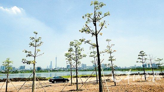 廣州臨江大道新種的木棉苗近日接受烈日的考驗(yàn)