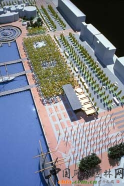 科學操場由一系列20英尺的方形磚平臺組成,逐步向高處延伸。每個平臺都將提供一個房間規模的室外展品和互動游戲藝術品空間。在整個展覽場布滿了各種各樣互動的水元素,如意大利花園中的大水法。鄰里步道,一條寬闊的鋪裝走道,為內港的人行尺度和界定西海岸空間邊界的宏大的建筑尺度這間提供了一個緩沖。步道的結構讓人回想起了巴爾的摩的連排屋,和曾經沿著Light街而布的水邊倉庫。藍蟹園,一個被動的,綠色的,起伏的地形,將成為附近社區居是的首選草坪,為這些社區提供游憩用的開放空間。