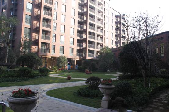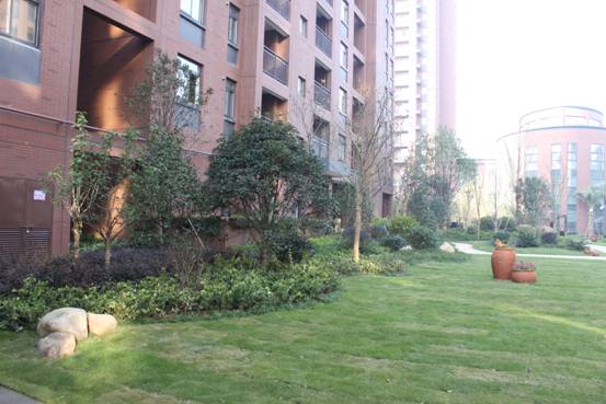 自然流暢的園路將綠地根據住戶的行走方便劃分開來,綠化疏密有致,形成"疏可跑馬,密不透風"的綠化景觀,草坪開闊處適當點綴瓦罐組合,使綠地看起來更加生動、活潑。