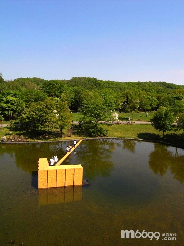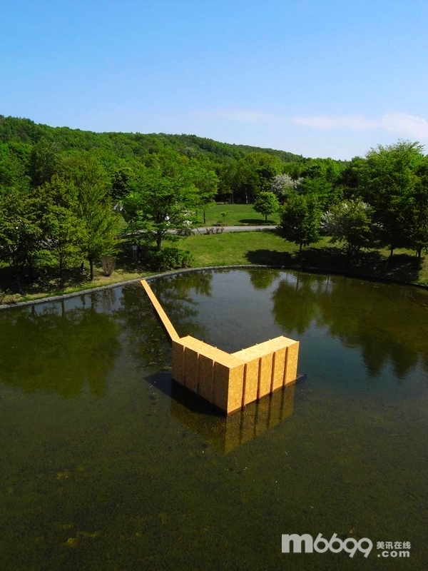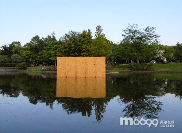 由日本建筑師山田良(ryo yamada)設(shè)計(jì)的“無限景觀”裝置位于日本札幌當(dāng)代藝術(shù)博物館的中心湖面上。參觀者必須要通過一條細(xì)長的小木橋才能從陸地到達(dá)湖中心的建筑裝置中。這個(gè)方盒子被OSB導(dǎo)向展板包圍。一旦進(jìn)入封閉的盒子中,墻壁和屋頂都是黑的,一絲光線都無法進(jìn)入,同時(shí)這個(gè)全黑的環(huán)境還讓參觀者喪失了方向感和時(shí)間感。