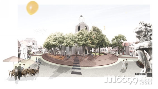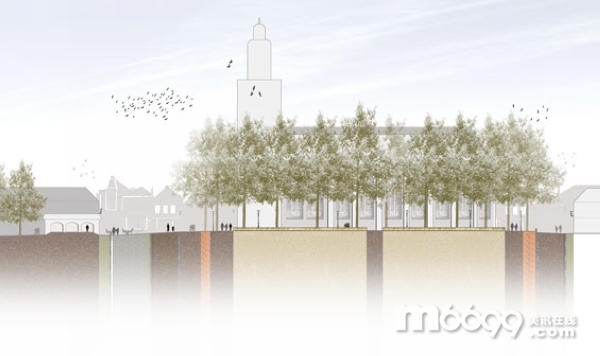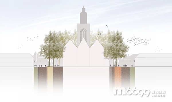 呈橢圓形三維狀分布的樹木是最為突出的空間元素,而現(xiàn)有的設(shè)計則將它變成了兩維。由紅磚鋪成的地面形成了整個廣場中性的色調(diào),彰顯著廣場的與眾不同。教堂的周圍有一個巨大的草坪。橢圓的結(jié)構(gòu)并不是一個一成不變的元素,在橢圓結(jié)構(gòu)的一些點上,有眾多元素,它們暗示著通道的位置,最重要的是凸顯Geuzenmonument的位置。為了避免沖突,廣場上的紀念碑使用了本名,這樣就不會和任何的嚴格的設(shè)計元素相沖突。