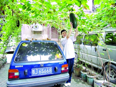 記者在現(xiàn)場(chǎng)看到,姜漢清在地上并排擺放了8個(gè)小桶,每個(gè)桶內(nèi)的植物均長(zhǎng)出長(zhǎng)藤,向上延伸,距離幾米開外同樣是8個(gè)桶,與之平行。兩邊植物伸出的長(zhǎng)藤“合二為一”,恰好“合攏”成車庫(kù)頂部。上面還吊著幾個(gè)碩大的冬瓜。