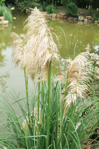 矮蒲葦(Cortaderia selloana ‘Pumila’),常綠多年生草本,株高120cm,葉聚生于基部,長而狹,邊有細齒,花序呈羽毛狀,銀白色。喜光,耐寒,要求土壤排水良好。為國外著名的觀賞草。